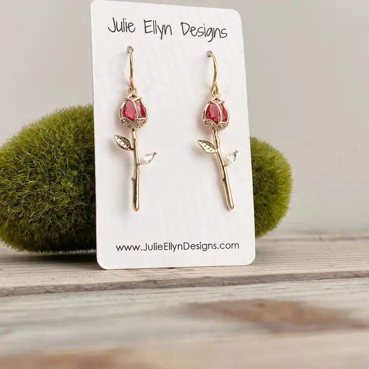 Delicate, romantic, and beautifully handcrafted, these Belle Rose Earrings bring a touch of timeless elegance to any look. Each earring features a sculpted gold-plated rose stem adorned with sparkling pink/red CZ stonesācapturing the charm of a blooming rosebud in dazzling detail. Lightweight and graceful, theyāre perfect for everyday wear or adding a soft, feminine finish to special occasions.