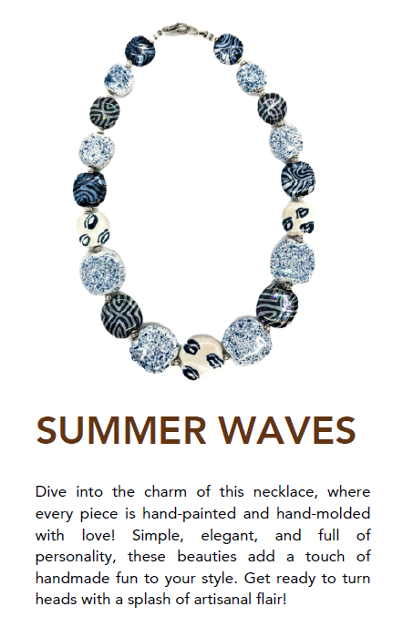 Dive into the charm of the Summer Waves Necklace, where every bead is hand-painted and molded with care. Inspired by the tranquil movement of ocean tides, this statement piece blends deep indigos and soft whites, creating a look that is effortlessly elegant and full of artisanal personality.