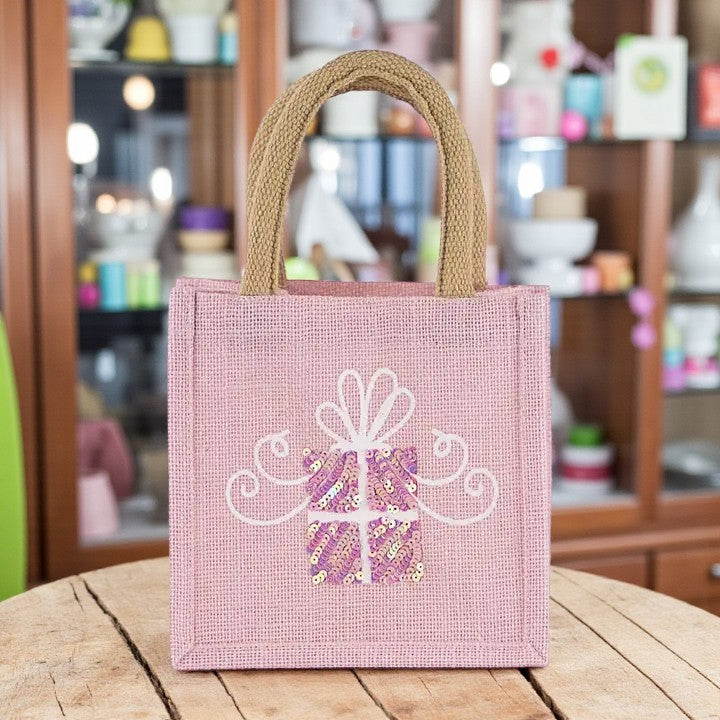 - Light pink jute tote with white handles and sequined present design