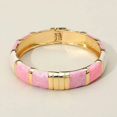Add a pop of Sweet Briar pink charm to your look with this elegant Enamel Bamboo Hinged Bangle. Featuring swirled pink, blush, and ivory enamel panels accented by soft gold tones, this bracelet brings vintage sophistication with a modern twist. The bamboo-inspired design and hinged closure make it both stylish and effortless to wear.