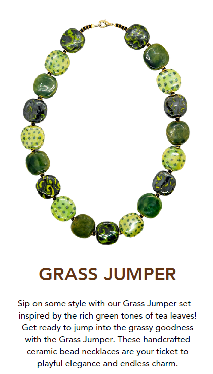 Sip on some style with the Grass Jumper Necklace — a bold statement of nature’s artistry. Inspired by the lush greenery of Kenya’s rolling tea hills, this handcrafted piece features hand-painted ceramic beads in varied shades of green. Each bead tells a story of craftsmanship and wild elegance, making it a standout addition to your collection.
