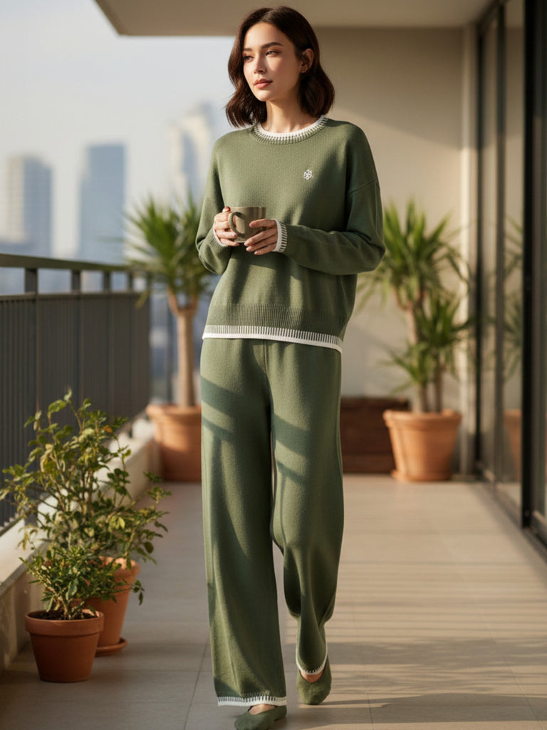 Easy, elevated, and made for off-duty comfort, this olive knit set brings cozy polish in one effortless look. The relaxed drop-shoulder top pairs with wide-leg pants for a flattering drape and all-day easeโperfect for campus lounging, travel days, or a chic Sweet Briar weekend. Subtle contrast trim keeps it crisp and modern.