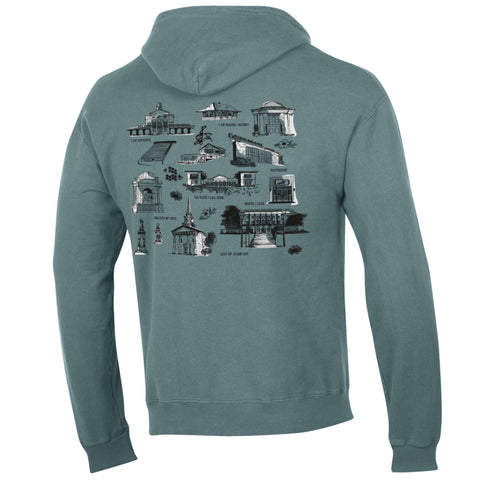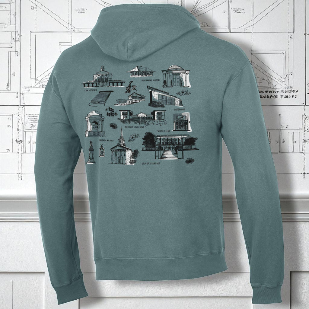 Wrap yourself in campus history with our Comfort Wash Hoodie in Cypress, featuring original artwork by artist Colleen. This exclusive design showcases Sweet Briar’s most iconic landmarks paired with empowering phrases that capture our bold spirit and sisterhood.