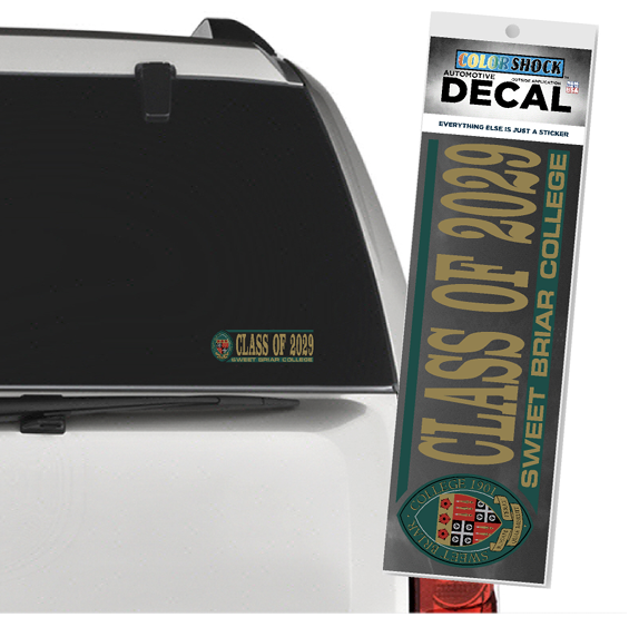 Show your Sweet Briar pride wherever you go with this Class of 2029 automotive decal. Featuring bold gold lettering and the Sweet Briar College crest on a deep green background, this weather-resistant decal is perfect for your car, laptop, or any smooth surface. Easy to apply and remove without residue, it’s a stylish way to celebrate your place in the Vixen family.