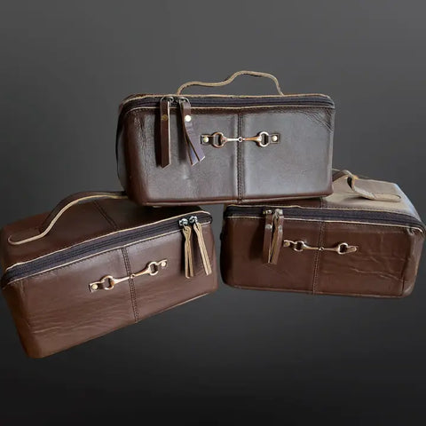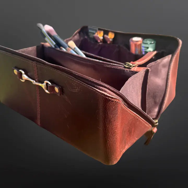 Saddle up in style with this Saddle Brown Equestrian Toiletry Bag, crafted for riders who appreciate luxury and practicality. Made of genuine distressed oily leather, this Sweet Briarāinspired piece features snaffle bit hardware and rich patina detailingāperfect for the refined equestrian.