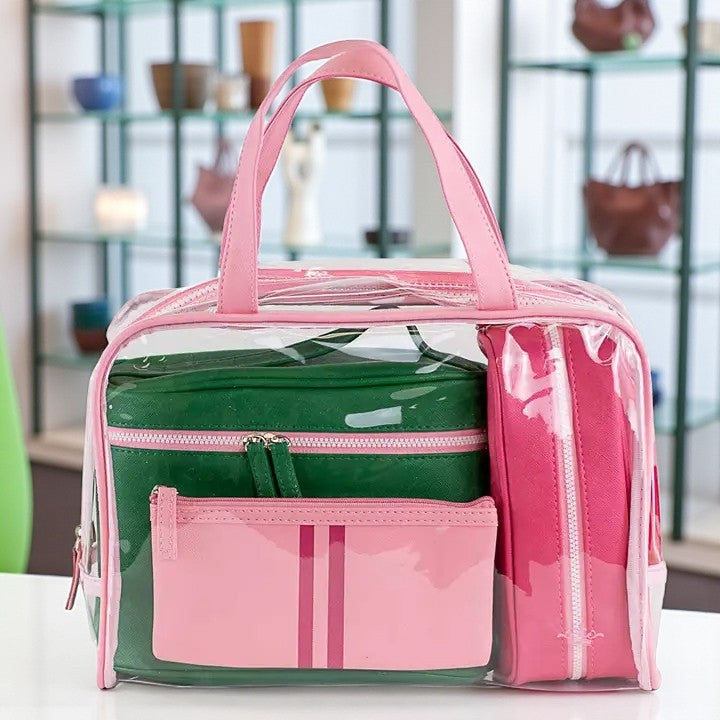 - Includes clear tote plus coordinating pouches in pink and kelly green