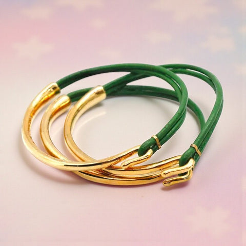 This striking bangle pairs rich green leather with sleek gold-plated metal for a look that’s both timeless and contemporary. Effortlessly versatile, it layers beautifully or stands alone as a refined statement piece.