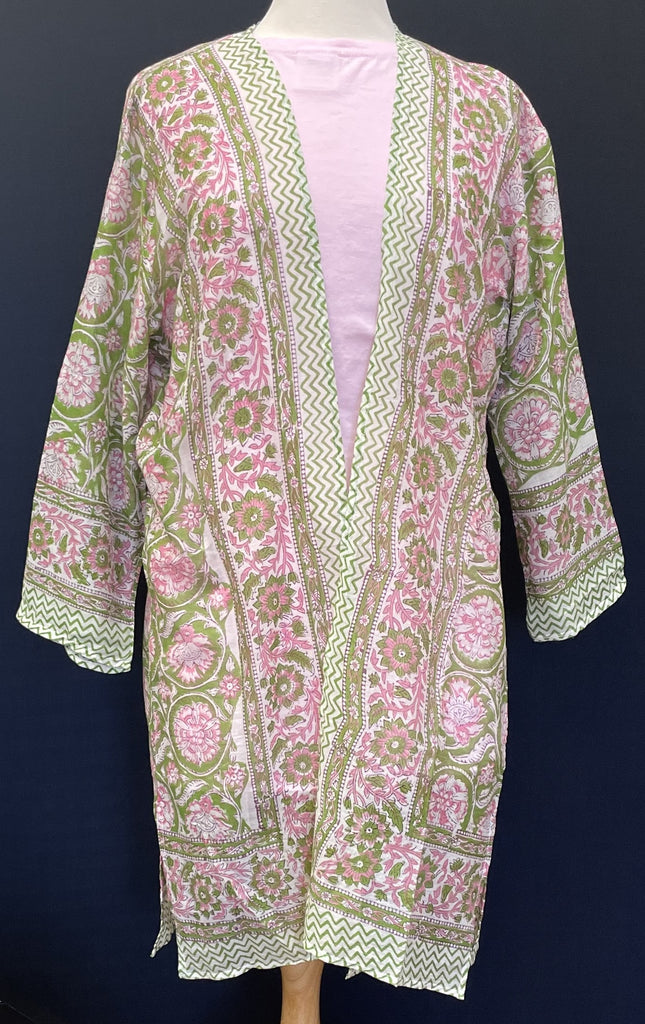 Wrap yourself in purpose and beauty with this handcrafted kimono, made by women artisans in India through the IndiArtisan Collective. Designed in a flowy one-size-fits-most cut (S–XL), this lightweight layer features a vibrant pink and green floral motif with intricate border detailing.