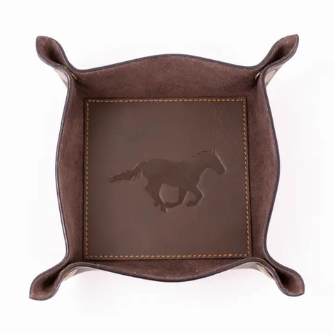 Keep your essentials organized with timeless sophistication. The Mustang Leather Embossed Valet Tray features a rich dark brown finish with a beautifully embossed running mustang—perfect for showcasing Sweet Briar spirit with everyday function. Ideal for holding keys, jewelry, watches, or small keepsakes, this tray brings style and practicality to any space.