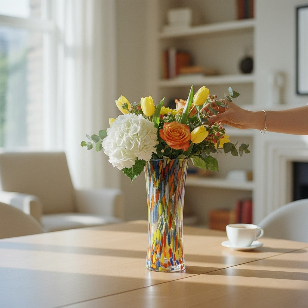 A celebration of Italian artistry, this hand-blown Murano glass vase captures a cascade of color in every curve. Shades of pink, orange, yellow, and blue dance together, creating a radiant display that shines with individuality and craftsmanship.