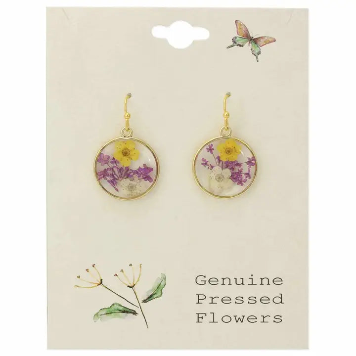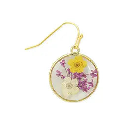 Bring a touch of Sweet Briarās garden charm wherever you go with these delicate Cottage Purple & Yellow Dried Flower Earrings. Handcrafted with genuine pressed flowers encased in clear resin and framed in gold, they capture the serene beauty of campus blooms in full spring. Perfect for alumnae and flower lovers alike.