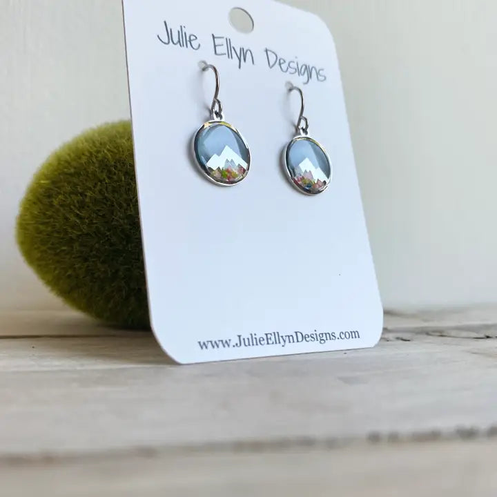 Carry a piece of the outdoors with you wherever you go. These Stained Glass Tiny Mountain Earrings capture a serene mountain landscape in miniature formācomplete with soft blue skies, golden peaks, and delicate flecks of color reminiscent of wildflower valleys. Each pair is handcrafted, giving every tiny scene its own unique charm.