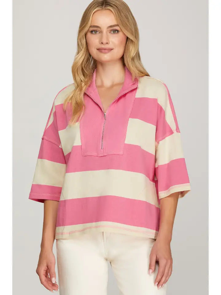 Bold stripes, soft structure. This preppy-meets-playful pullover is the perfect pop of color for your everyday wardrobe. With a roomy fit, functional pockets, and a half-zip neckline, it's weekend-ready and effortlessly cute.