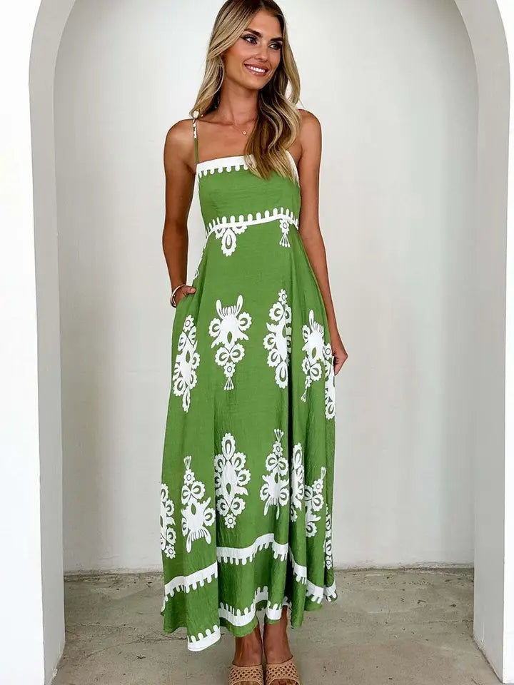 Turn heads in effortless Sweet Briar style. This lightweight green maxi dress features crisp white embroidery and a flattering silhouette perfect for summer days or nights out. The adjustable spaghetti straps and flowing skirt offer both comfort and grace.