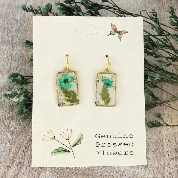 Inspired by Sweet Briarās serene natural beauty, these genuine pressed flower earrings bring a breath of springtime elegance to any look. The delicate turquoise blooms and green leaves are encased in clear resin with a gold border ā a timeless nod to the collegeās rolling meadows and refined charm.