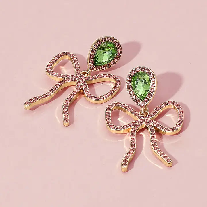 Add a touch of playful sophistication to your look with these sparkling bow earrings โ the perfect blend of elegance and charm inspired by Sweet Briarโs signature pink and green. Featuring teardrop gems and crystal accents, these earrings bring a refined sparkle to any outfit, from campus celebrations to evening gatherings.