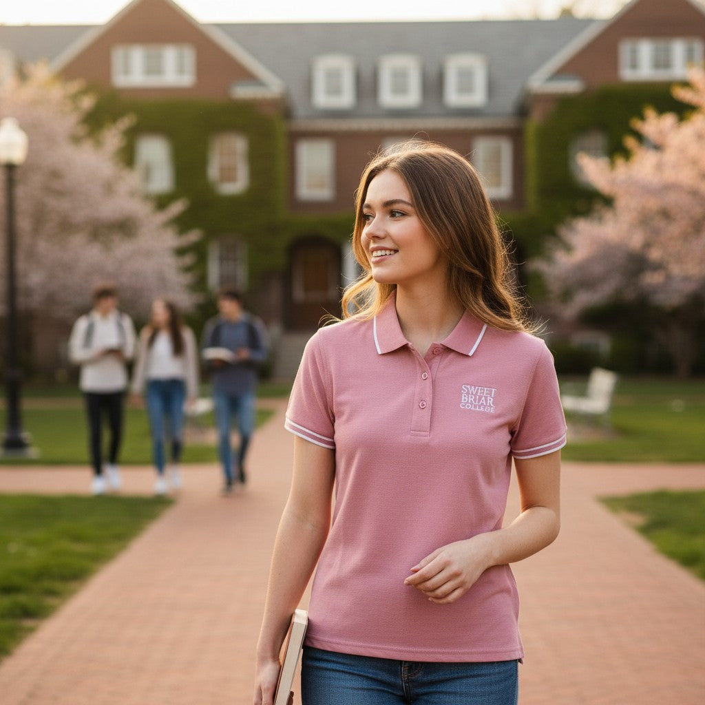 Step onto campus or into the office with effortless SBC pride. This classic collared polo blends comfort, polish, and signature Sweet Briar charm. Soft pink fabric is accented with crisp white tipping and features the Sweet Briar College wordmark embroidered at the chestâtimeless, flattering, and perfect for everyday wear.